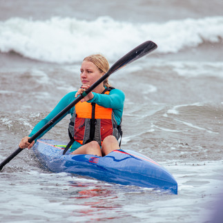 Paddlers started close to the beach and raced in heats of 3-6 around a rectangular course, finishing back at the beach. The wind was strong, and a tough onshore chop made it tricky to reach the first turning mark. The effort was rewarded with awesome surfing runs on the way in!